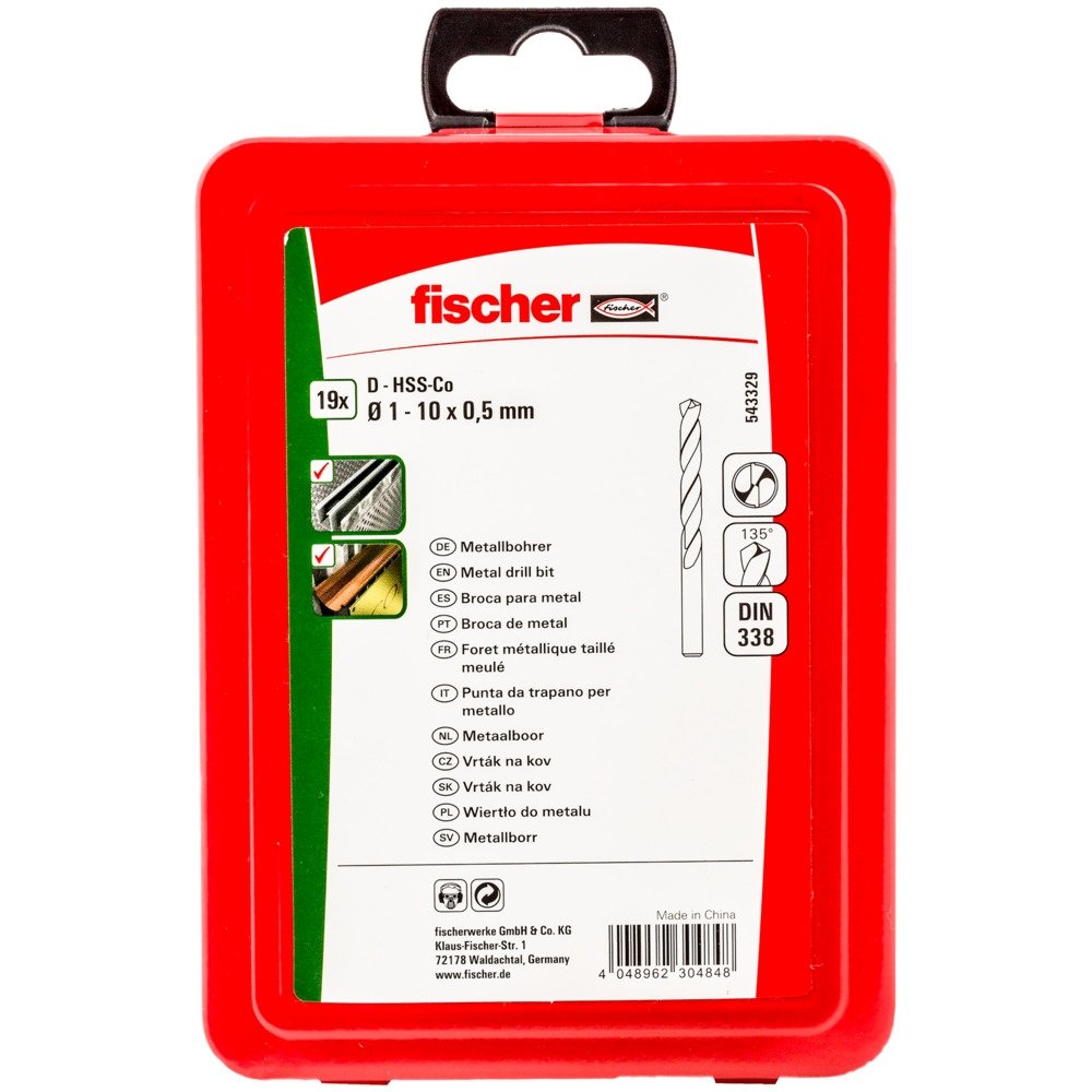 Estuche de brocas para metal HSS-G con aleación de cobalto (5% Co) DIN338 1-10 mm 19pcs., de la familia Herramientas y utillaje instalador de la marca FISCHER. Producto profesional de fijaciones distribuido por NEODIST.