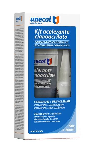 KIT ACELERANTE+CIANO M.POROSOS,Bot.50 g+Aeros.200ml de la marca UNECOL. Adhesivo instantáneo de alta calidad para unión de materiales en industria y fontanería. Producto profesional distribuido por NEODIST.
