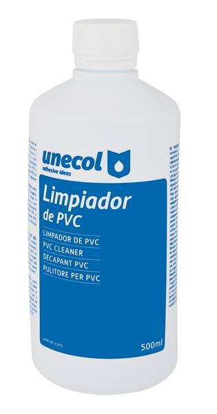 LIMPIADOR PVC, Botella plástico 500 ml de la marca UNECOL. Adhesivo de alta calidad para unión y sellado de tuberías y accesorios de PVC y plásticos. Producto profesional distribuido por NEODIST.