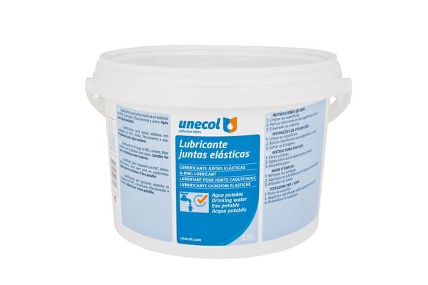 LUBRICANTE JUNTAS ELASTICAS, Cubo 2,5 L de la marca UNECOL. Auxiliar de fontanería de alta calidad para instalaciones de fontanería, climatización y gas. Producto profesional distribuido por NEODIST.