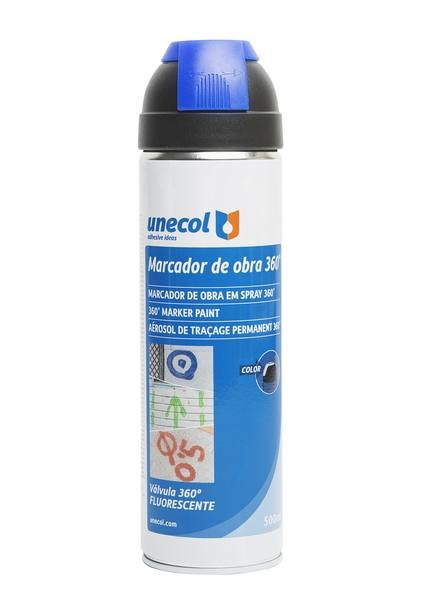 MARCADOR 360° AZUL, Spray 500 ml (C12) de la marca UNECOL. Auxiliar de fontanería de alta calidad para instalaciones de fontanería, climatización y gas. Producto profesional distribuido por NEODIST.