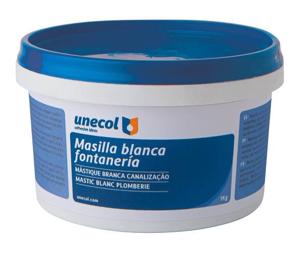 MASILLA BLANCA FONTANERIA, Bote 1Kg de la marca UNECOL. Auxiliar de fontanería de alta calidad para instalaciones de fontanería, climatización y gas. Producto profesional distribuido por NEODIST.