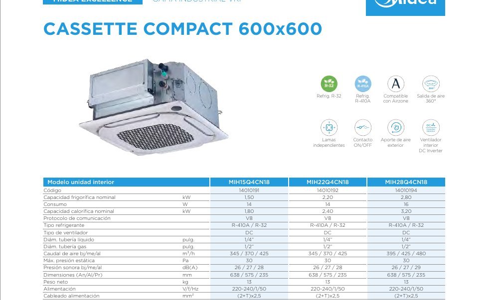 MIDEA MIH15Q4CN18 – U.Int. Cassette 4 vías 600×600 V8 1,5kW Fri. 1,8kW Cal.