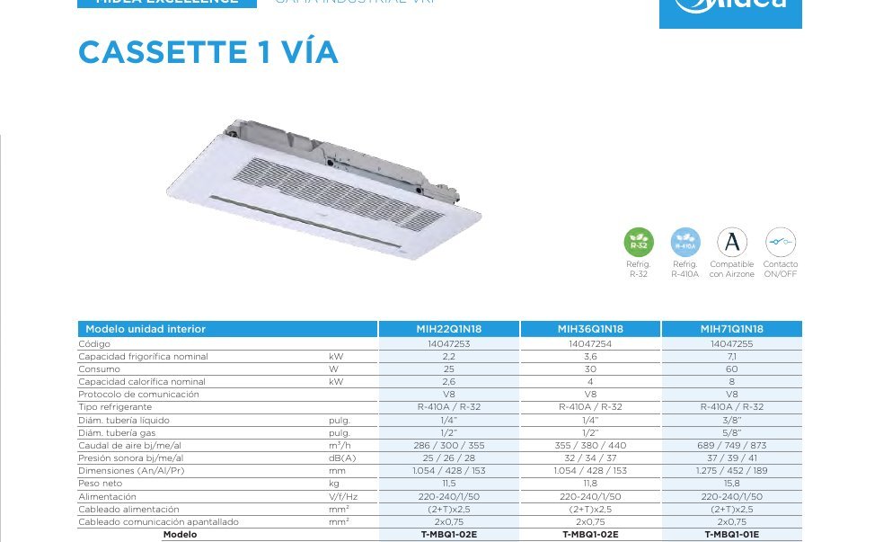 MIDEA MIH71Q1N18 – U.Int. Cassette 1 vía V8 7,1kW Fri. 8,0kW Cal.
