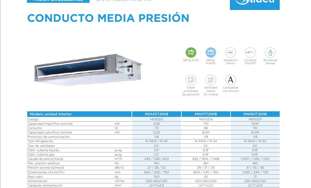 MIDEA MIH71T2N18 – U.Int. Conductos Media P. V8 7,1kW Fri. 8,0kW Cal.