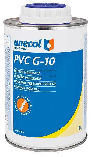 PVC G-10, Bote metálico 1 L con pincel de la marca UNECOL. Adhesivo de alta calidad para unión y sellado de tuberías y accesorios de PVC y plásticos. Producto profesional distribuido por NEODIST.