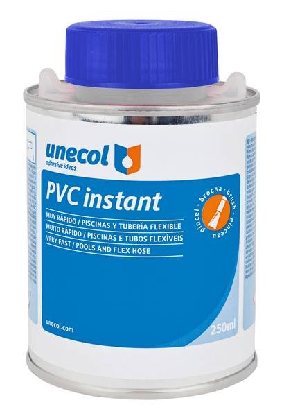 PVC INSTANT, Bote metálico 250 ml con pincel de la marca UNECOL. Adhesivo de alta calidad para unión y sellado de tuberías y accesorios de PVC y plásticos. Producto profesional distribuido por NEODIST.