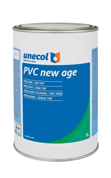 PVC NEW AGE, Bote metálico 1L con tapa presión de la marca UNECOL. Adhesivo de alta calidad para unión y sellado de tuberías y accesorios de PVC y plásticos. Producto profesional distribuido por NEODIST.