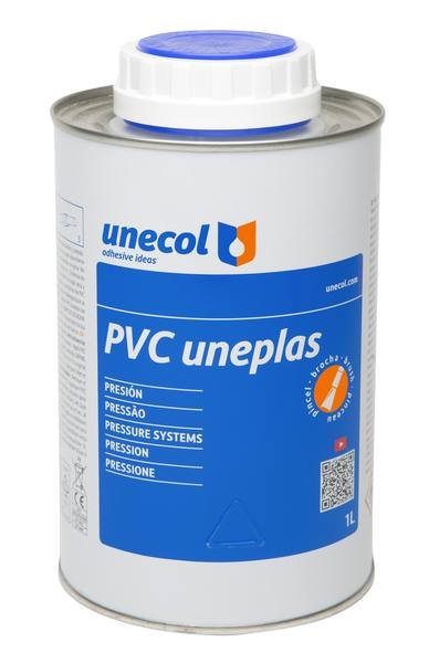 PVC UNEPLAS, Bote metálico 1 L con pincel de la marca UNECOL. Adhesivo de alta calidad para unión y sellado de tuberías y accesorios de PVC y plásticos. Producto profesional distribuido por NEODIST.