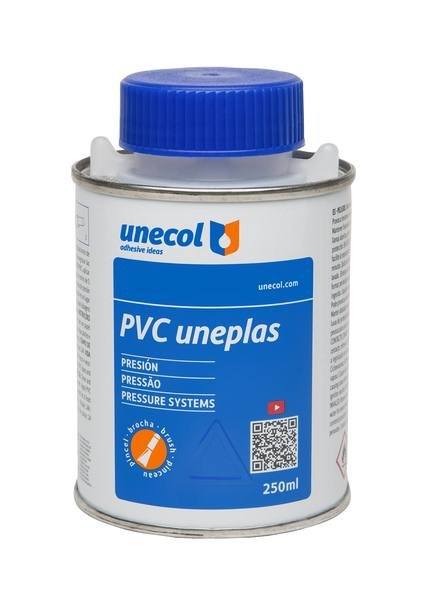PVC UNEPLAS, Bote metálico 250 ml con pincel de la marca UNECOL. Adhesivo de alta calidad para unión y sellado de tuberías y accesorios de PVC y plásticos. Producto profesional distribuido por NEODIST.