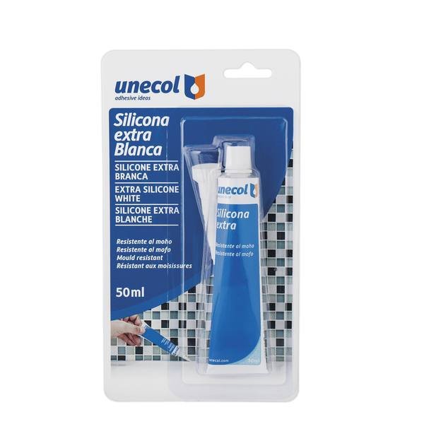 SILICONA EXTRA BLANCA, Blister con tubo 50 ml de la marca UNECOL. Sellador de alta calidad para sellado, impermeabilización y fijación. Producto profesional distribuido por NEODIST.
